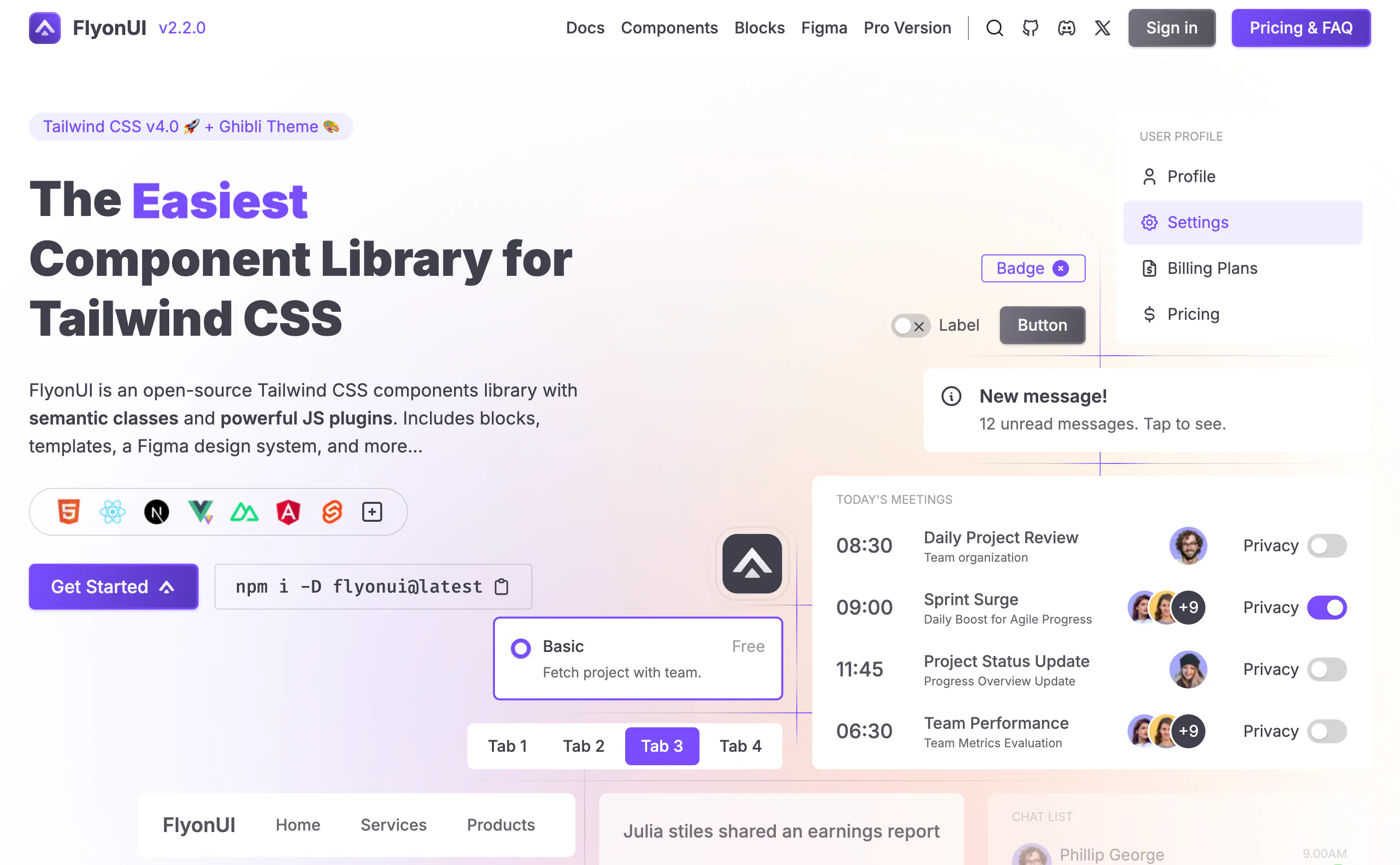 Fly on UI is an open-source Tailwind CSS components library with semantic classes and powerful JS plugins.